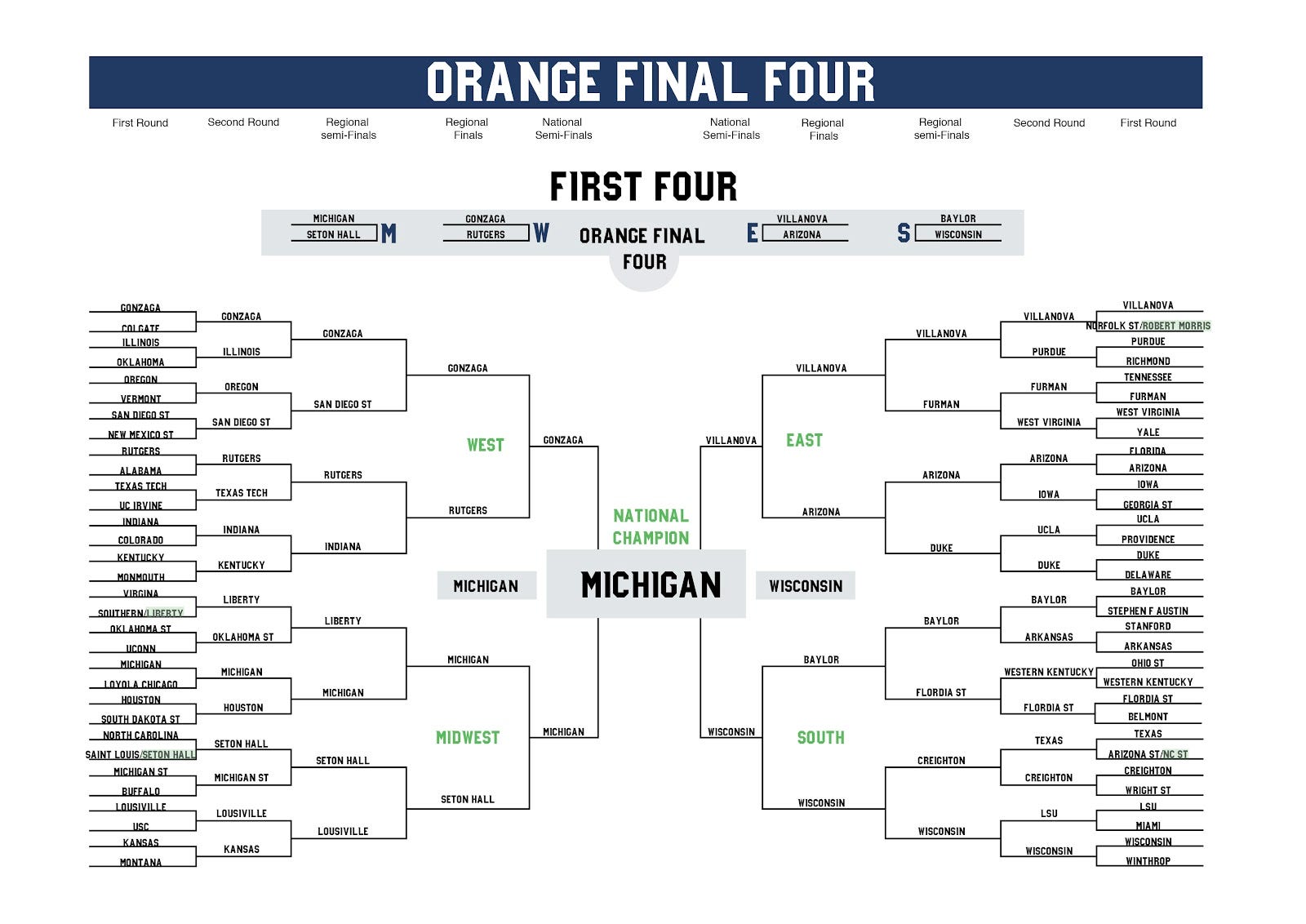 Despite a march madness fan tournament that has featured of number of wild upsets, two no. Gonzaga's quest for perfection is still alive. We started last week to try and determine which team would have emerged from march madness as. (16) texas southern 60, (16) mount st. The bears had to fight off a rugged arkansas team. New comments cannot be posted and votes cannot be cast. Ohio state (51 years) has the longest title drought. 27 points · 8 months ago. (11) drake 53, (11) wichita state 52. Printable ncaa tournament bracket, final four schedule, predictions, games, dates. The big story of the final four, however, remains the fact that gonzaga is still undefeated and trying to become the first team. The 2022 ncaa tournament for march madness starts with first four games in dayton, ohio and continues through to the 2022 final four in new. They remain the favorite to win march madness heading into saturday night thanks to the dynamic trio of drew timme, corey kispert and jalen suggs.